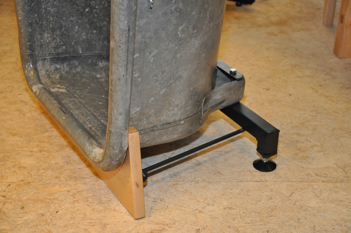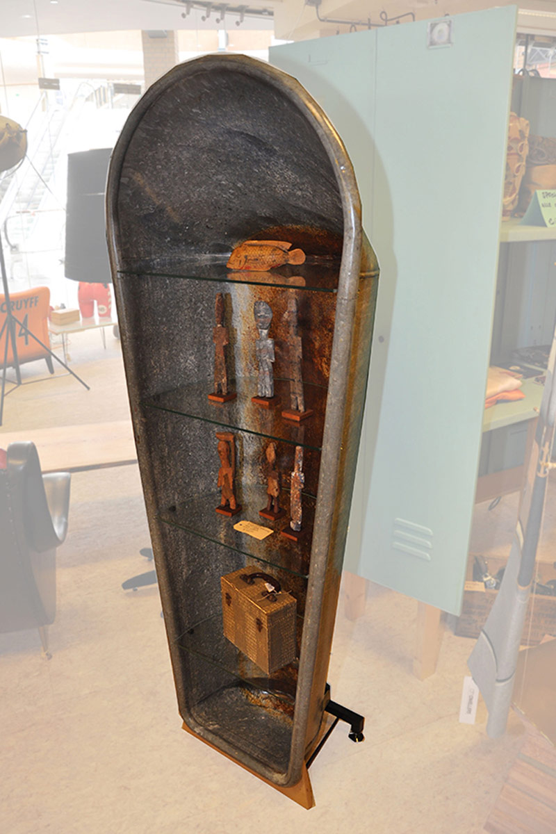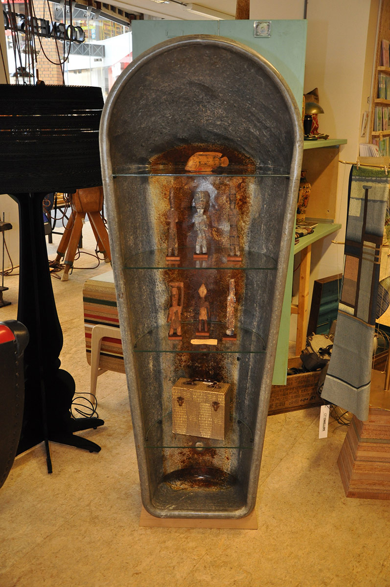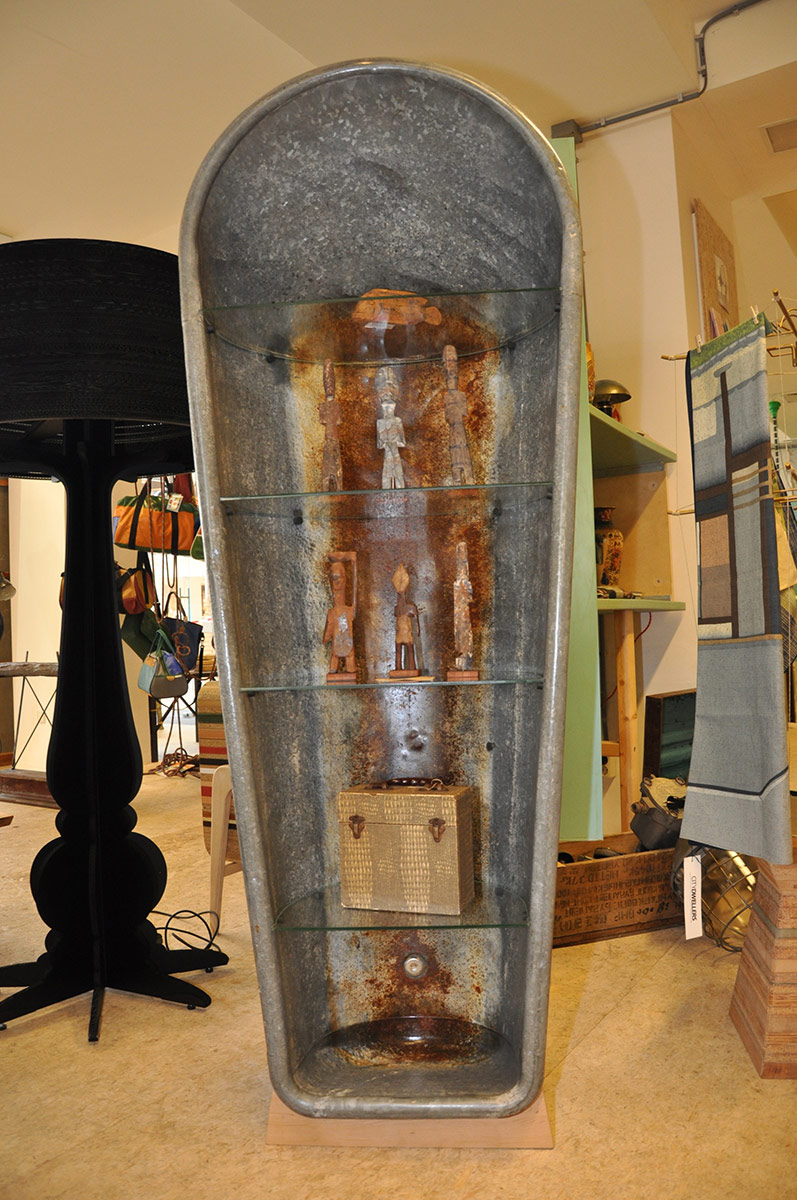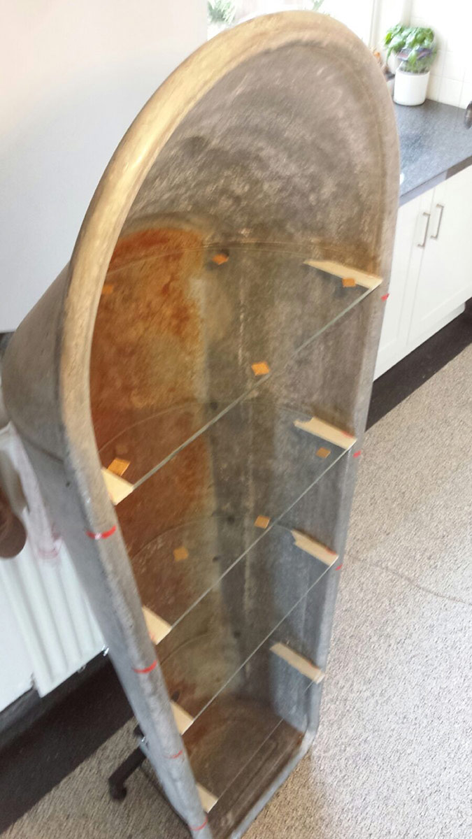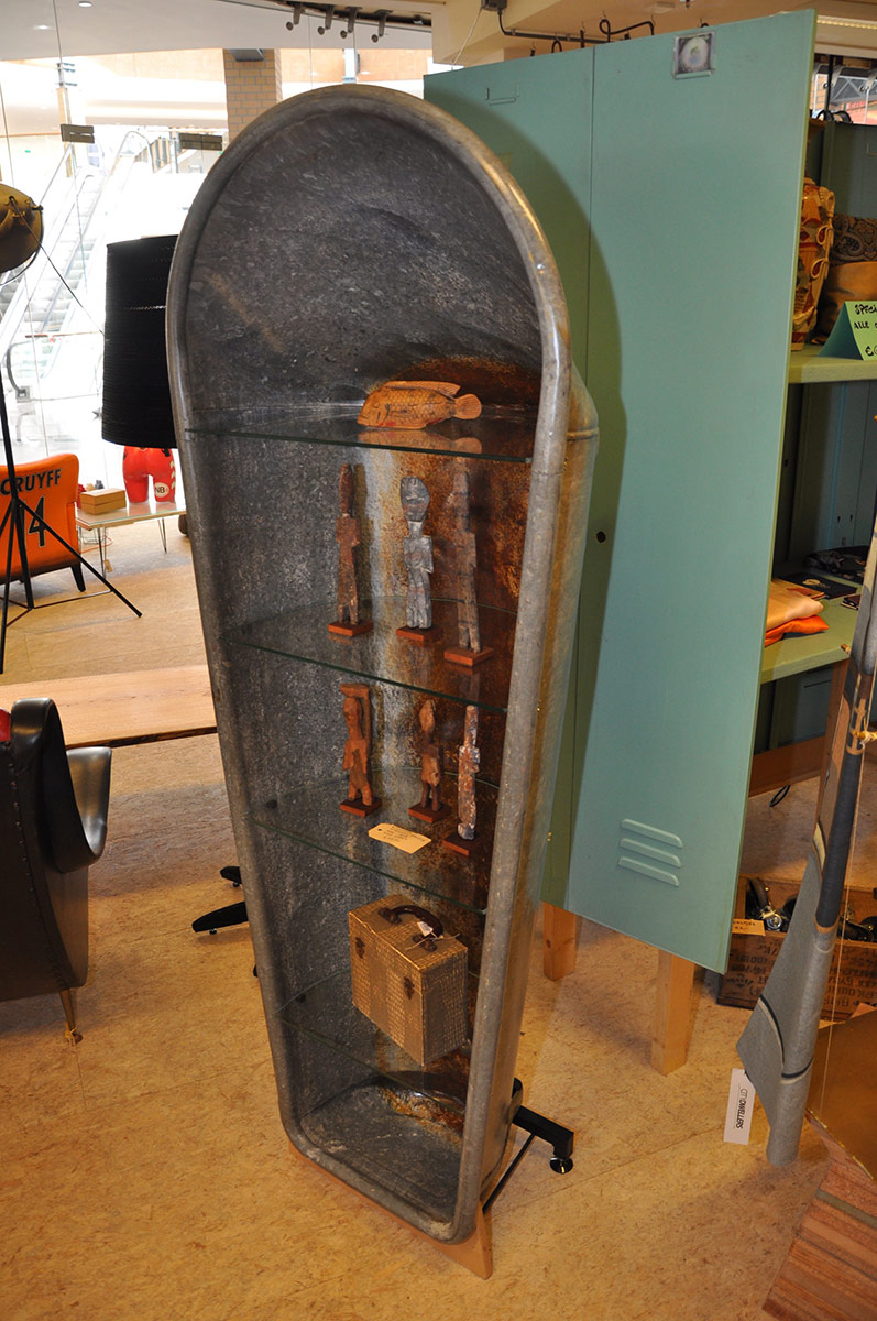 Een zinken badkuip, passend glas, slim voetje