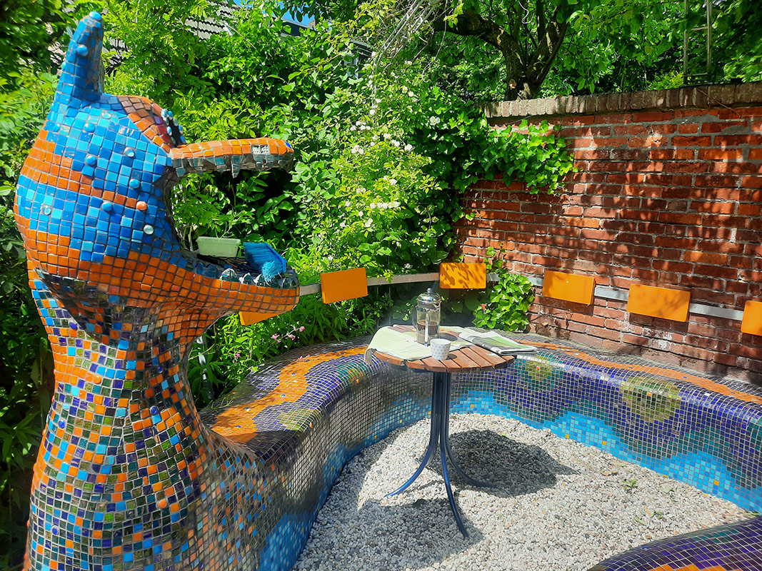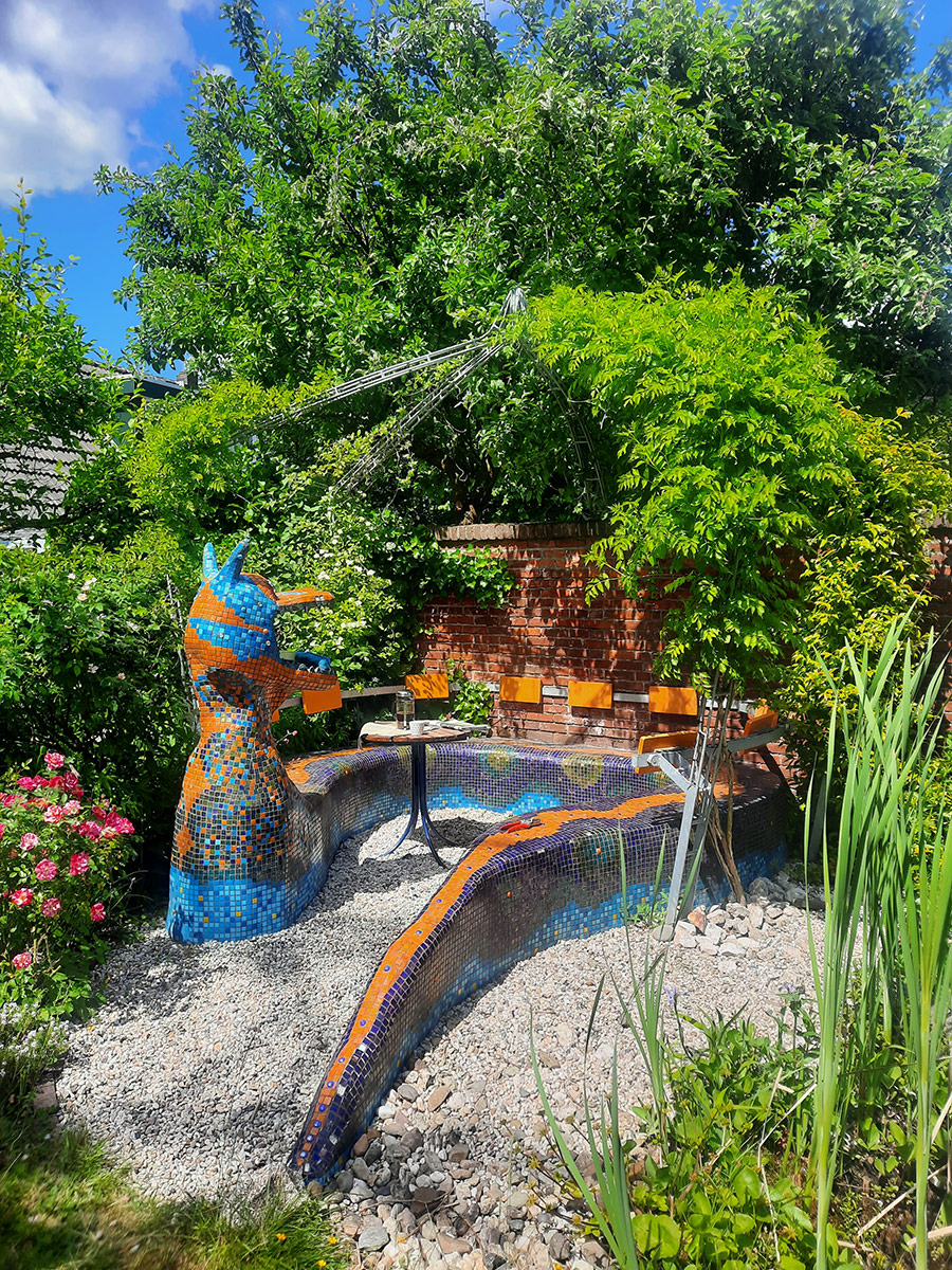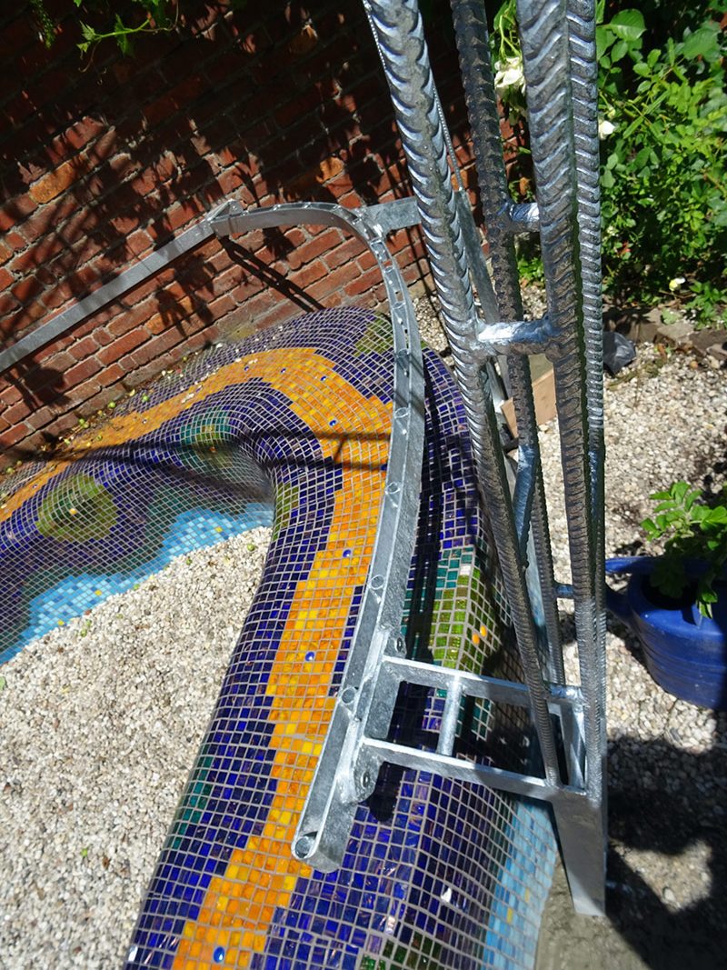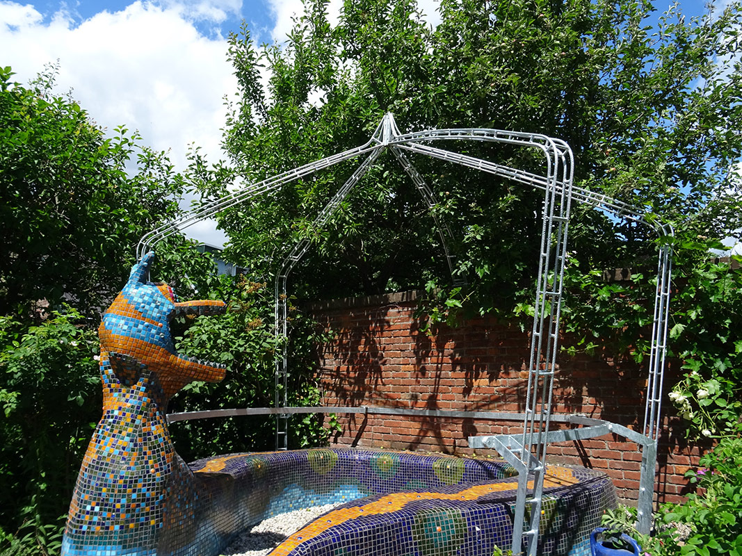 De Draak was er al, een pergola eroverheen voor begroeiing, en een rugleuning voor comfort.