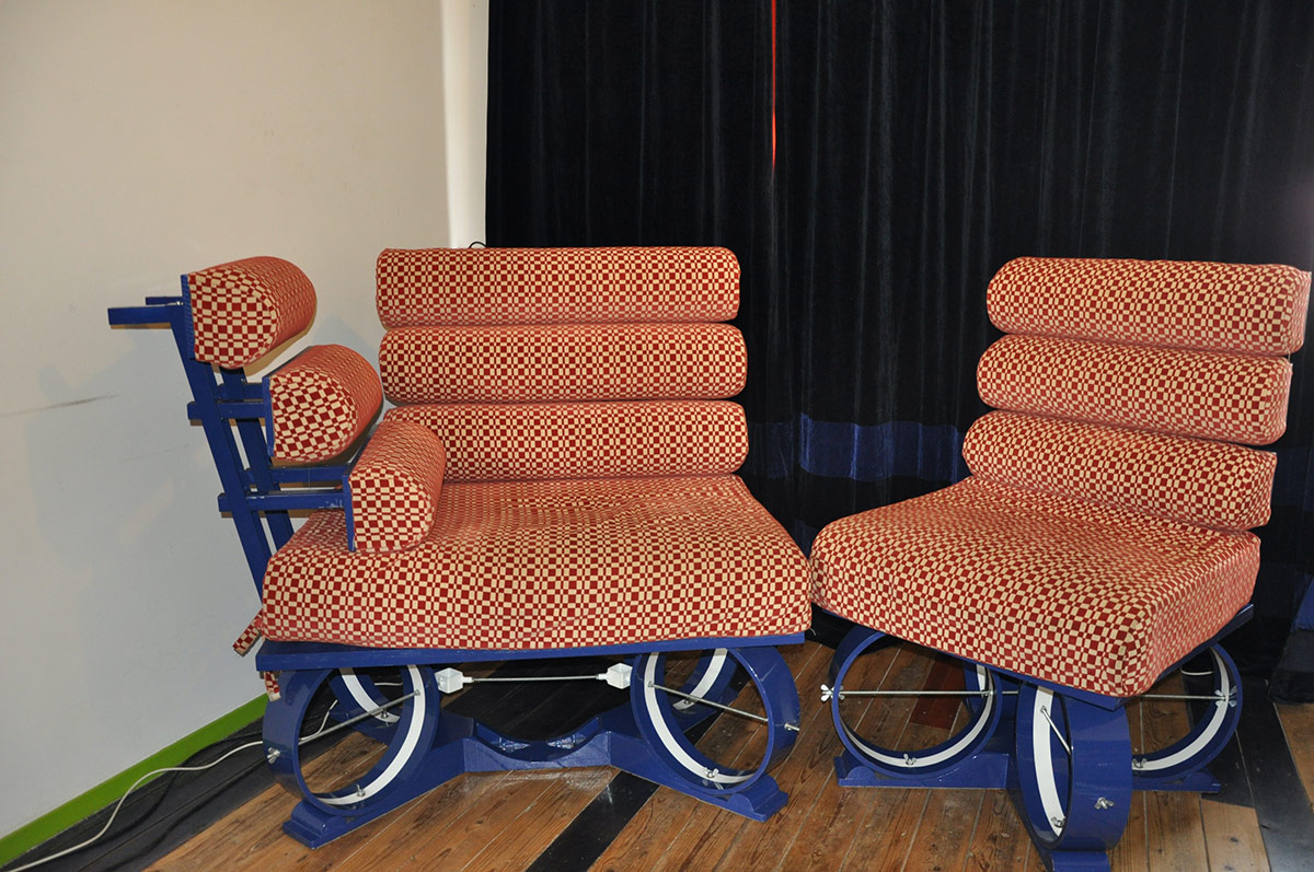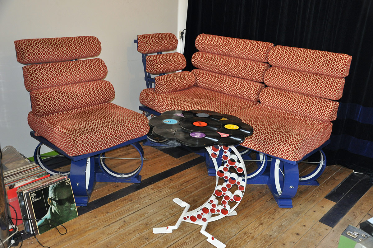 Originele hoogzitter, in retrostof, in delen verstelbare rugleuning.