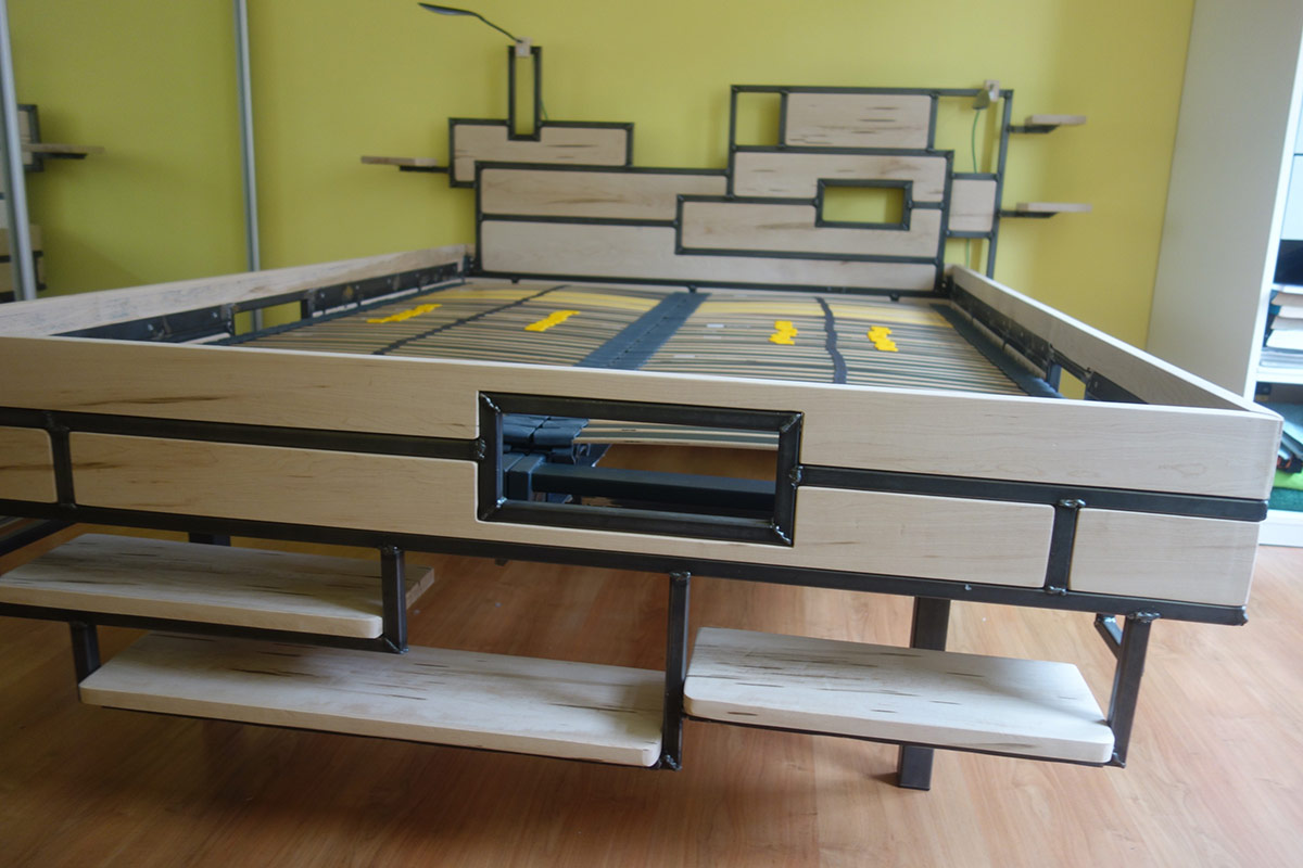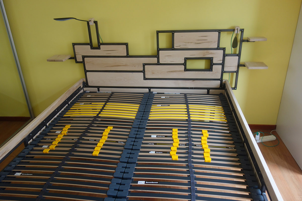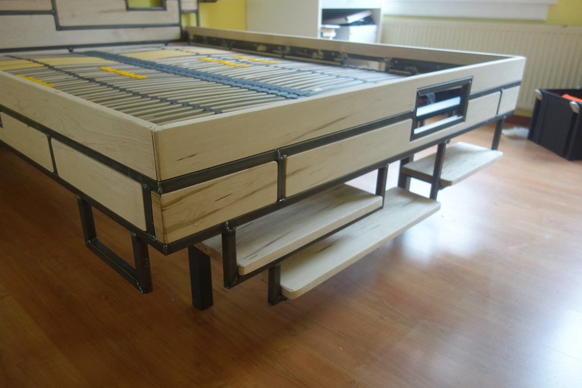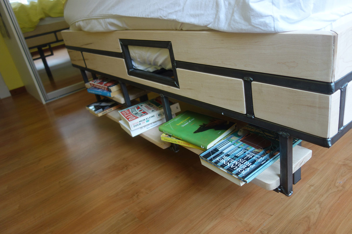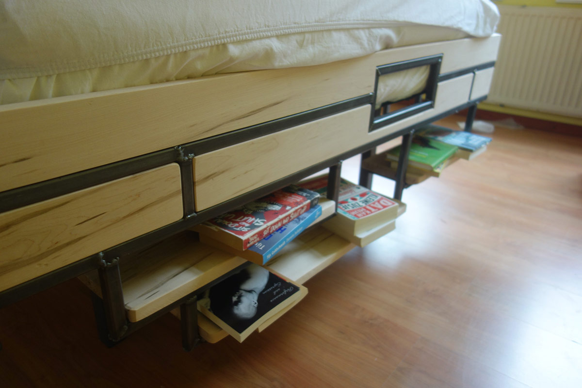 Op verzoek, ontwerp en bouw bed met hoge instap en boekenplanken.