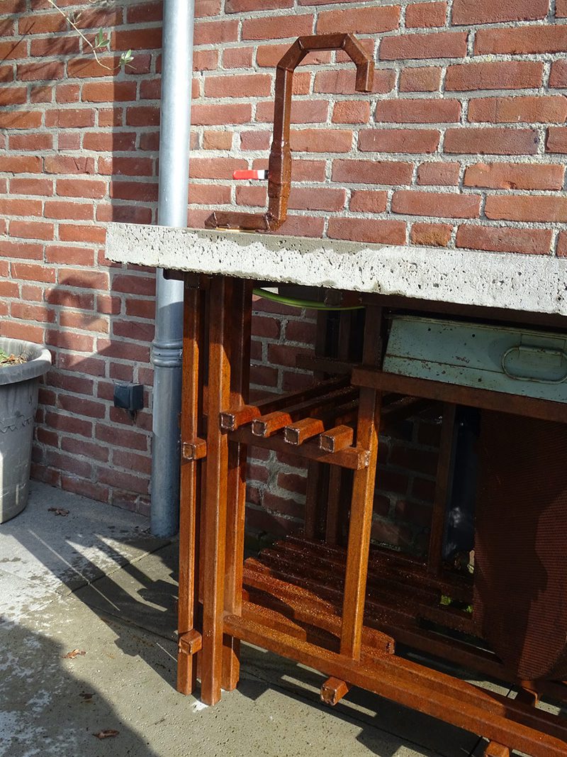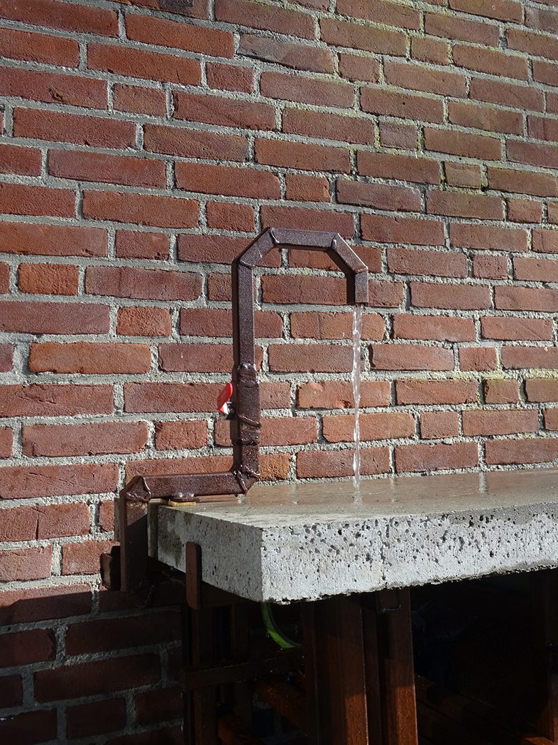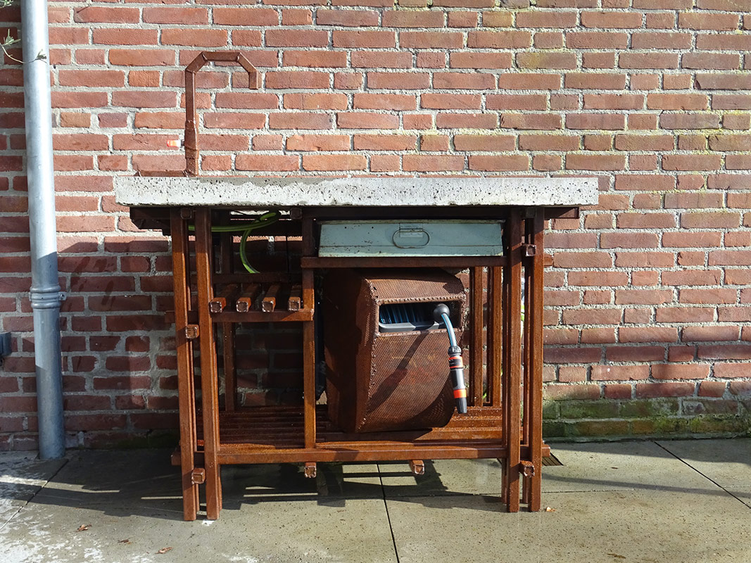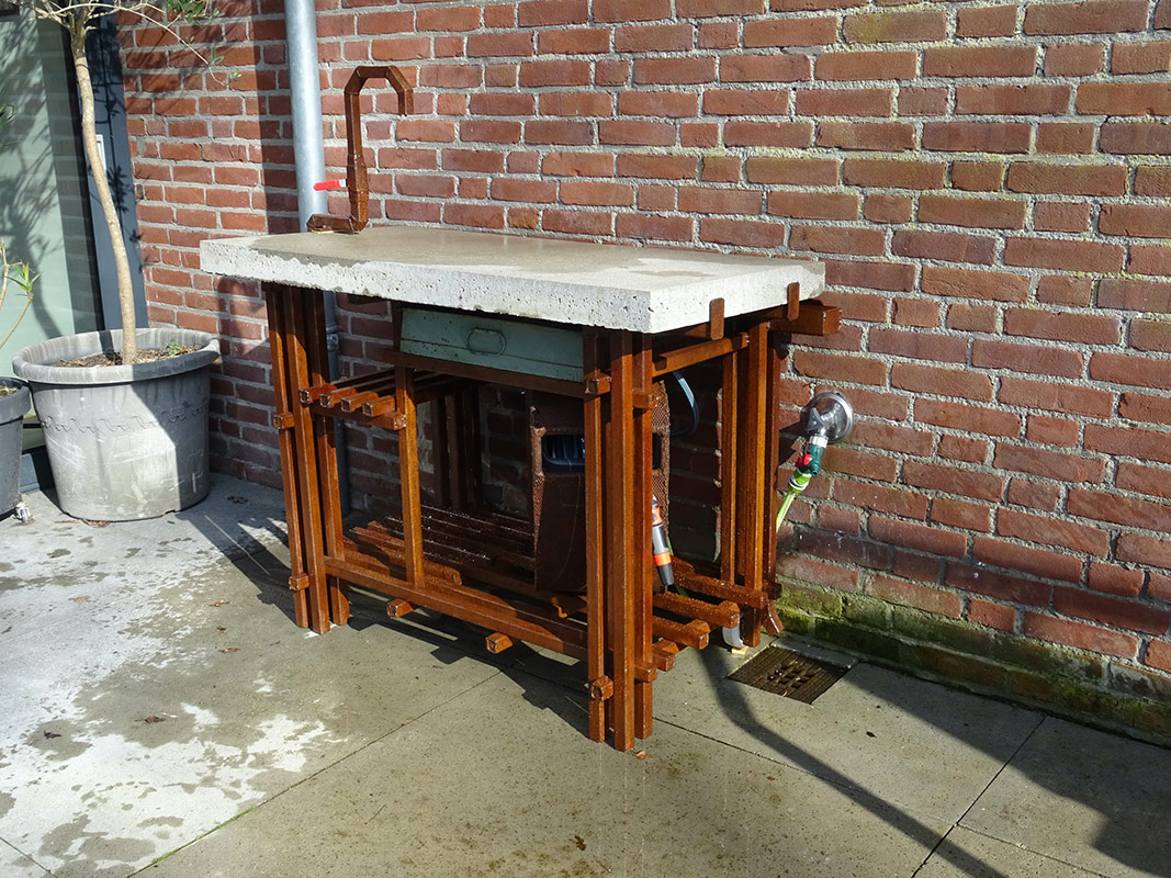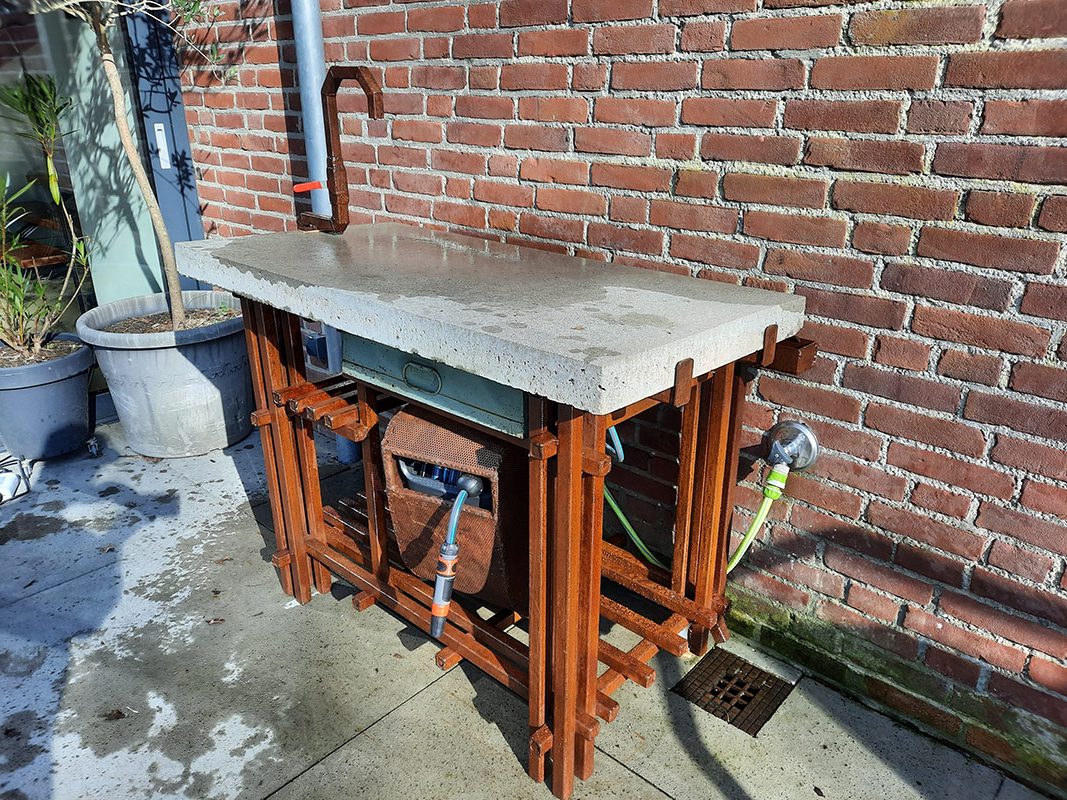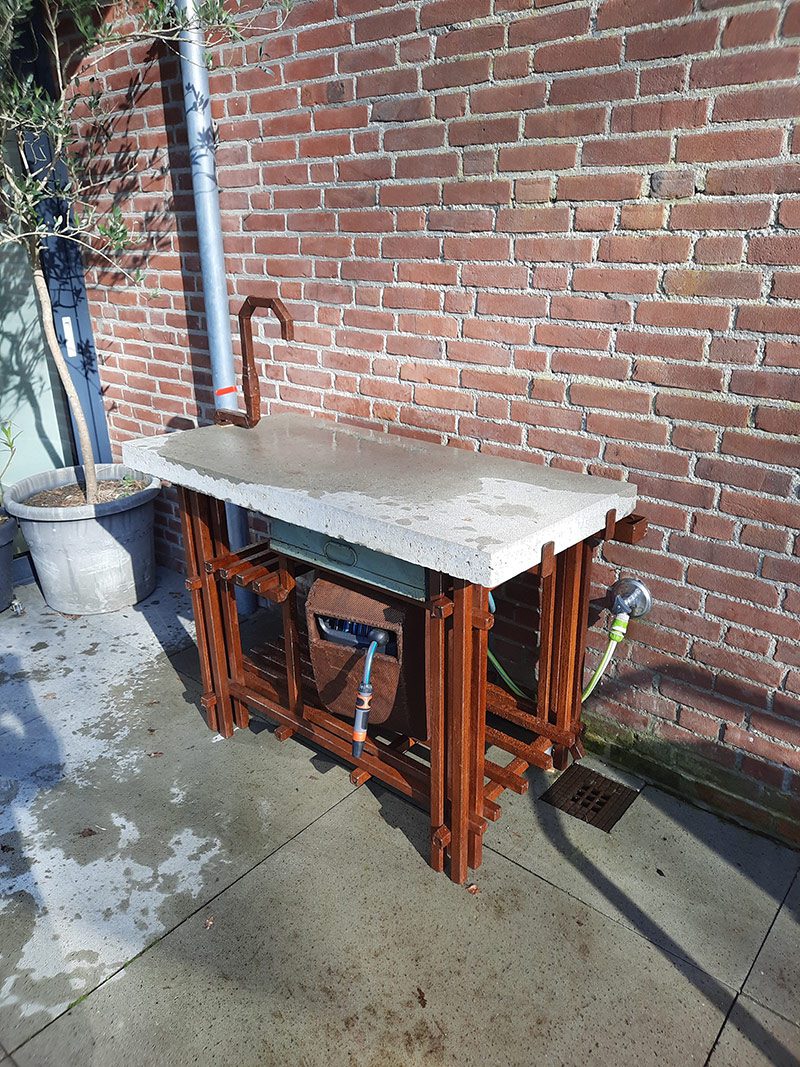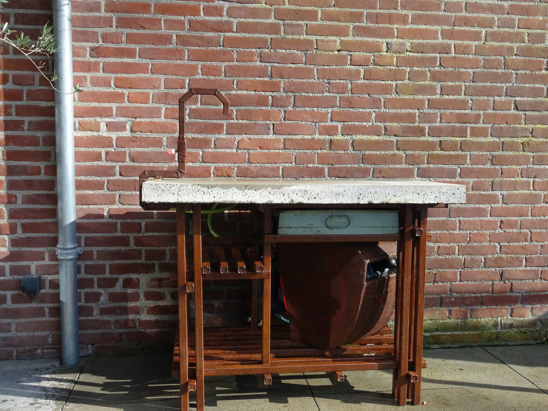 Tafel met kraan, en tuinslanghaspel. Stenen tafelblad.