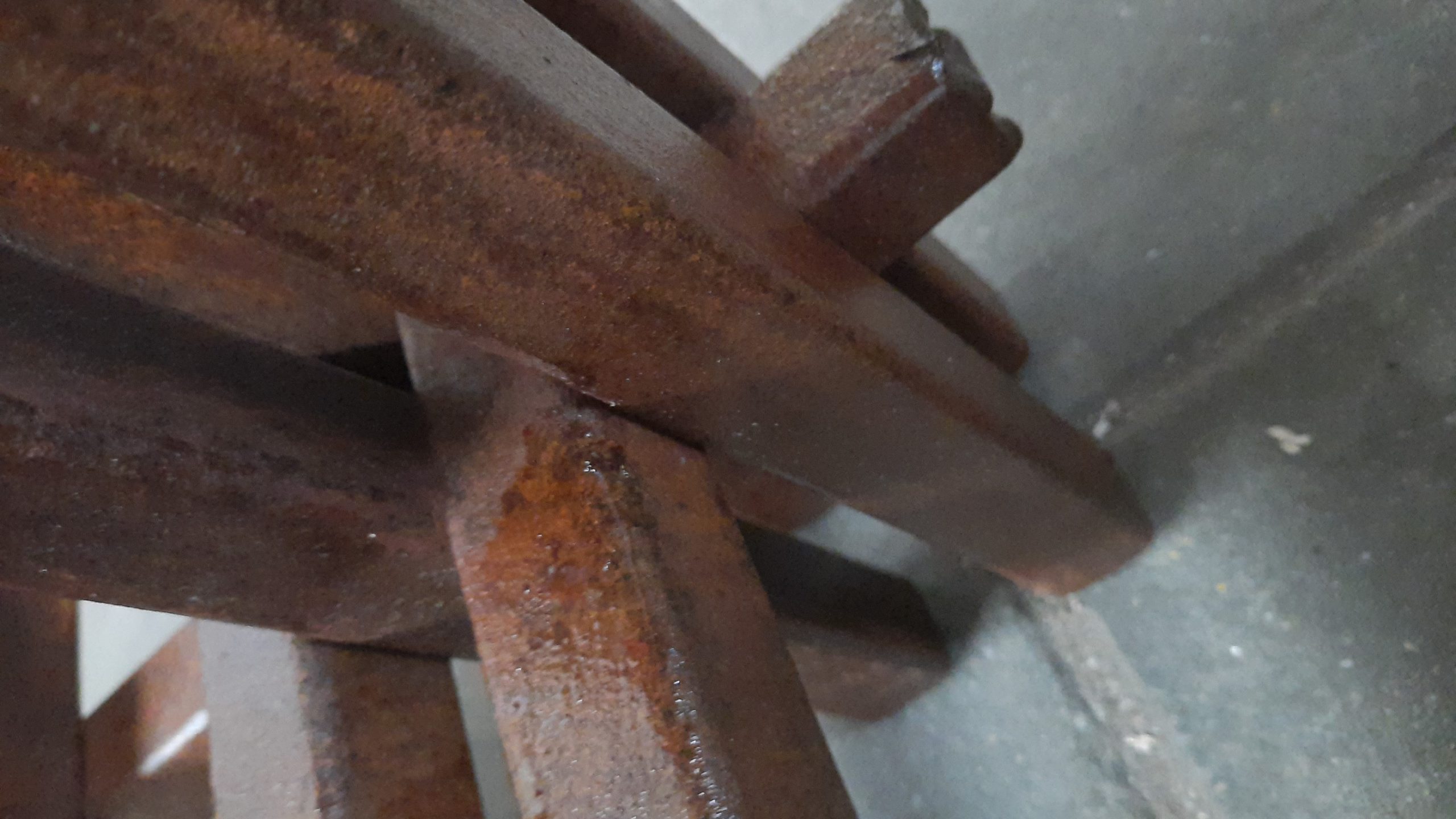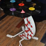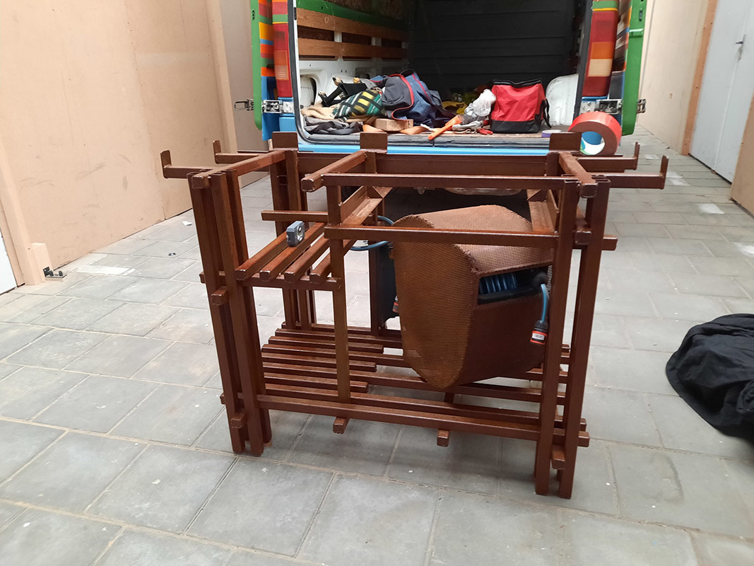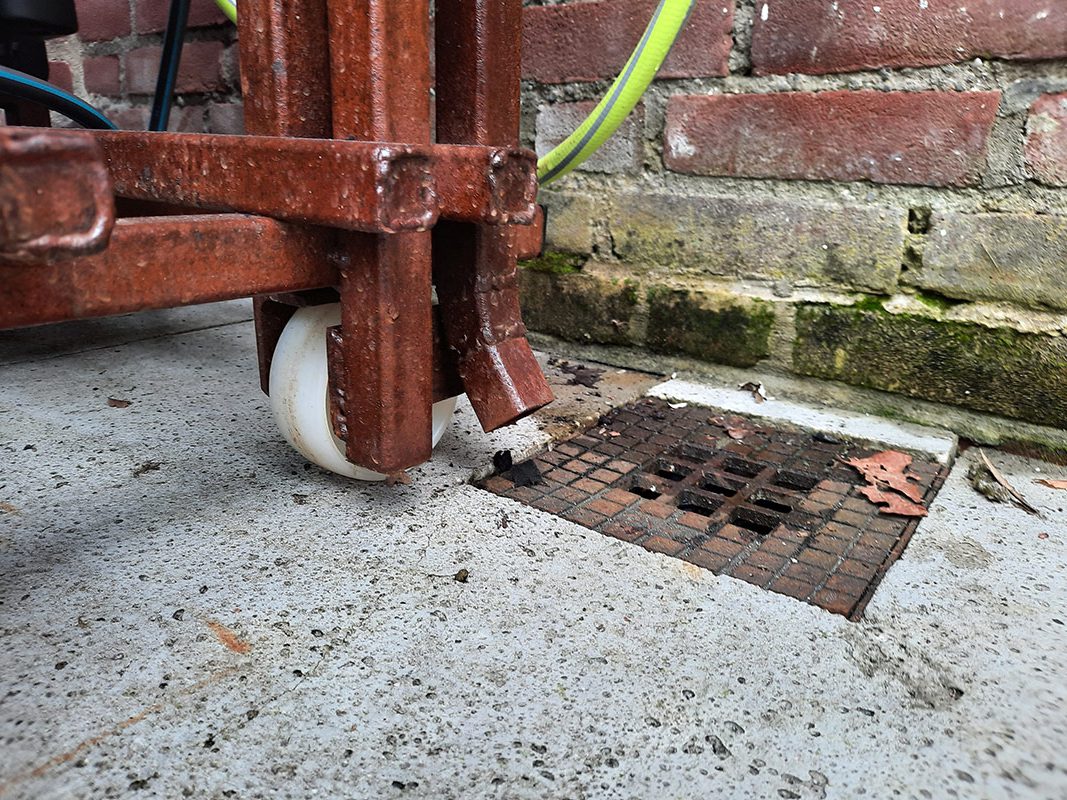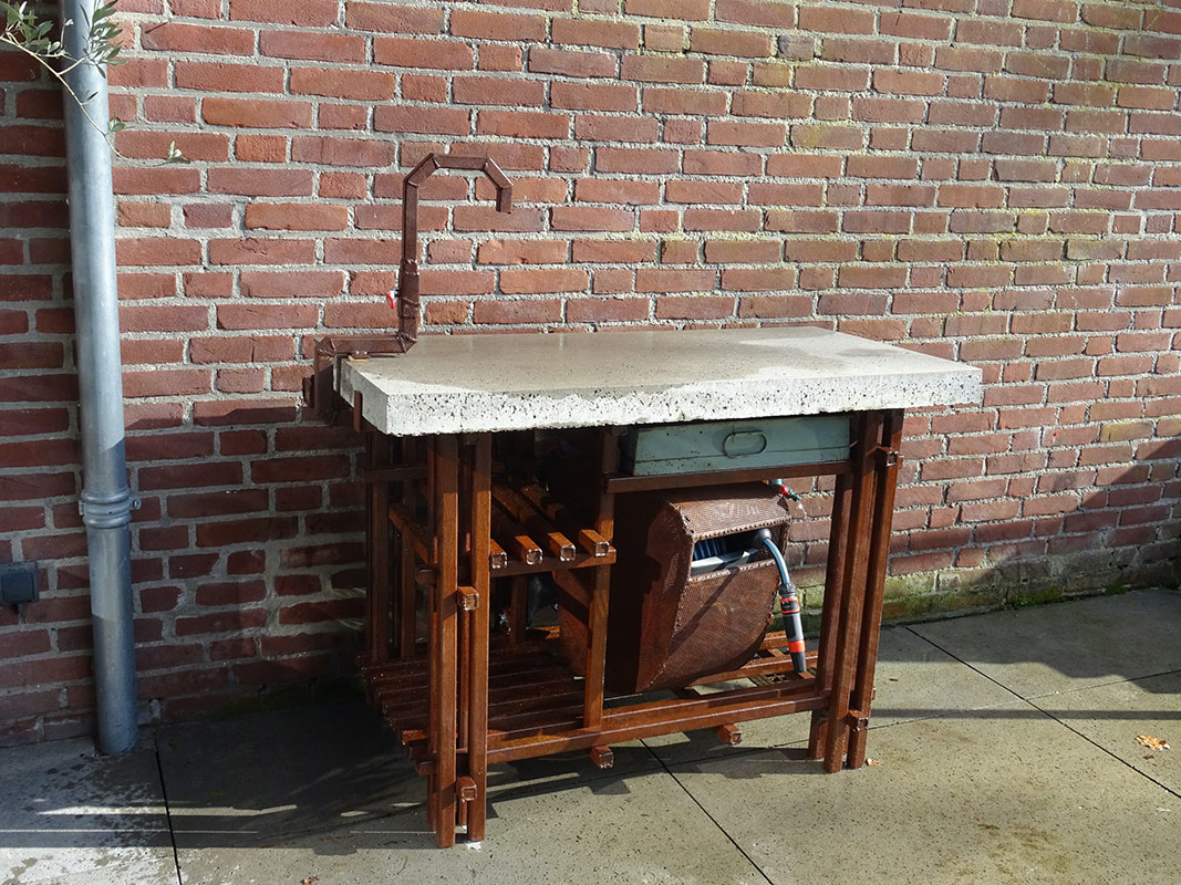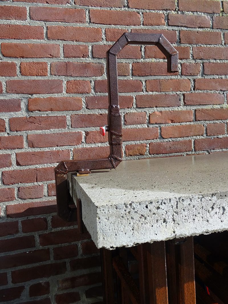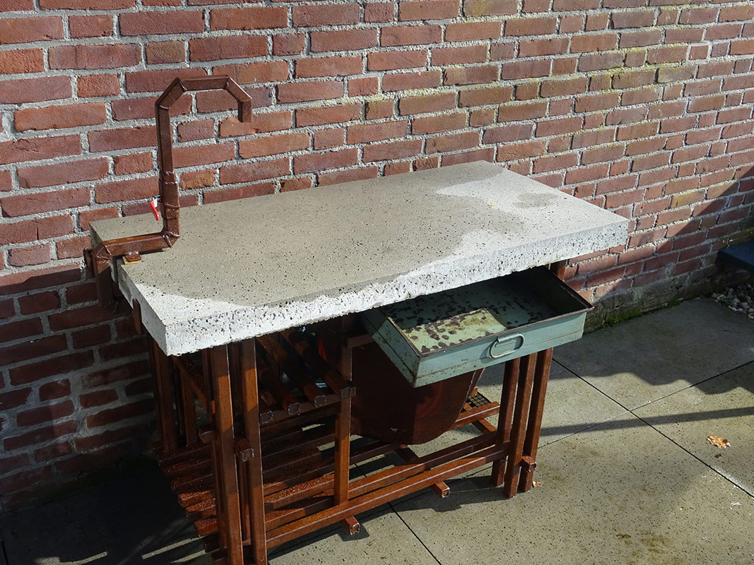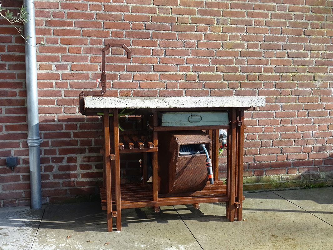 Tafel met kraan, en tuinslanghaspel. Stenen tafelblad.