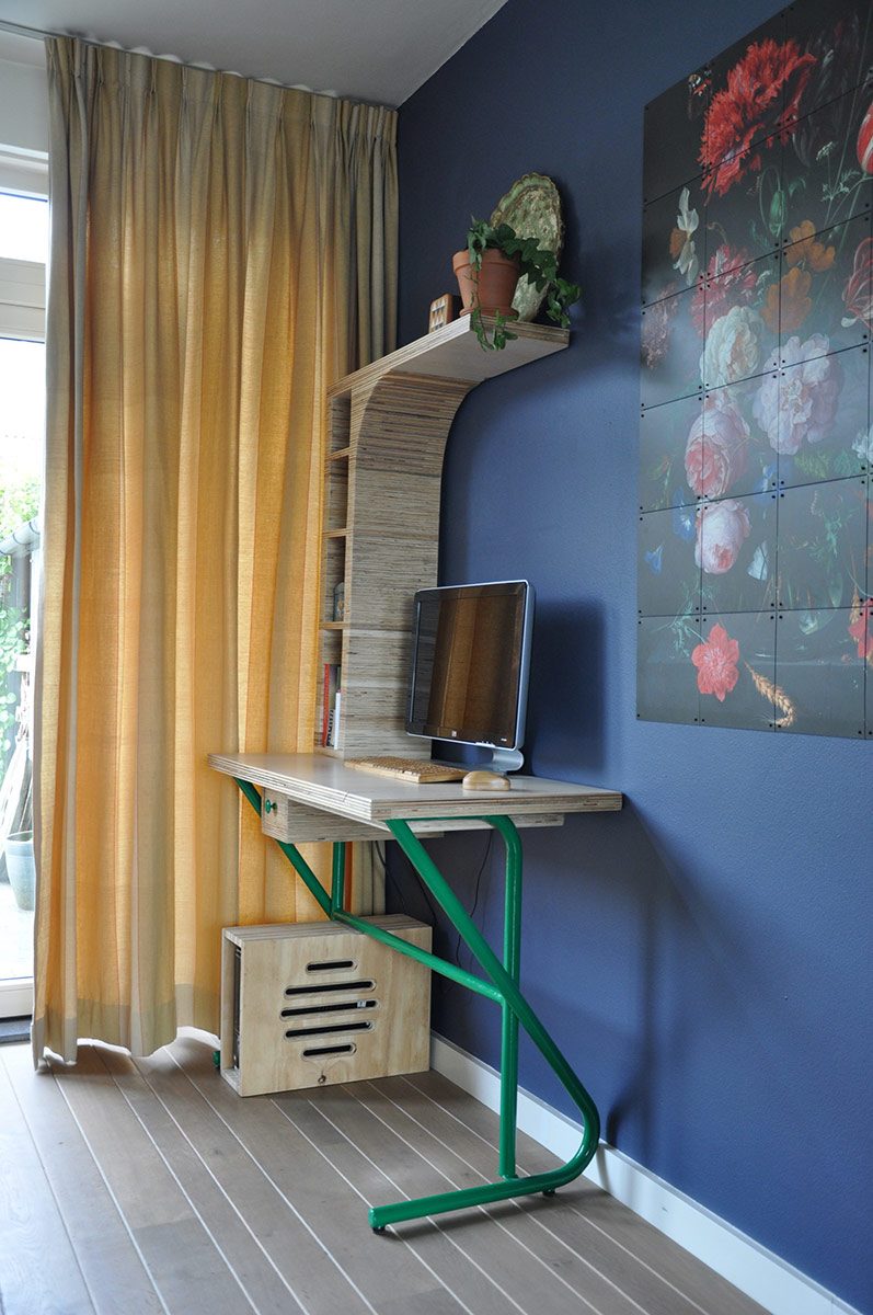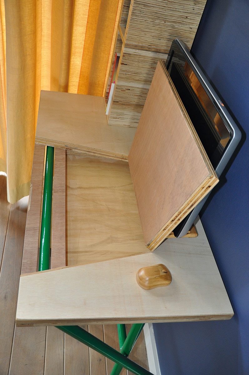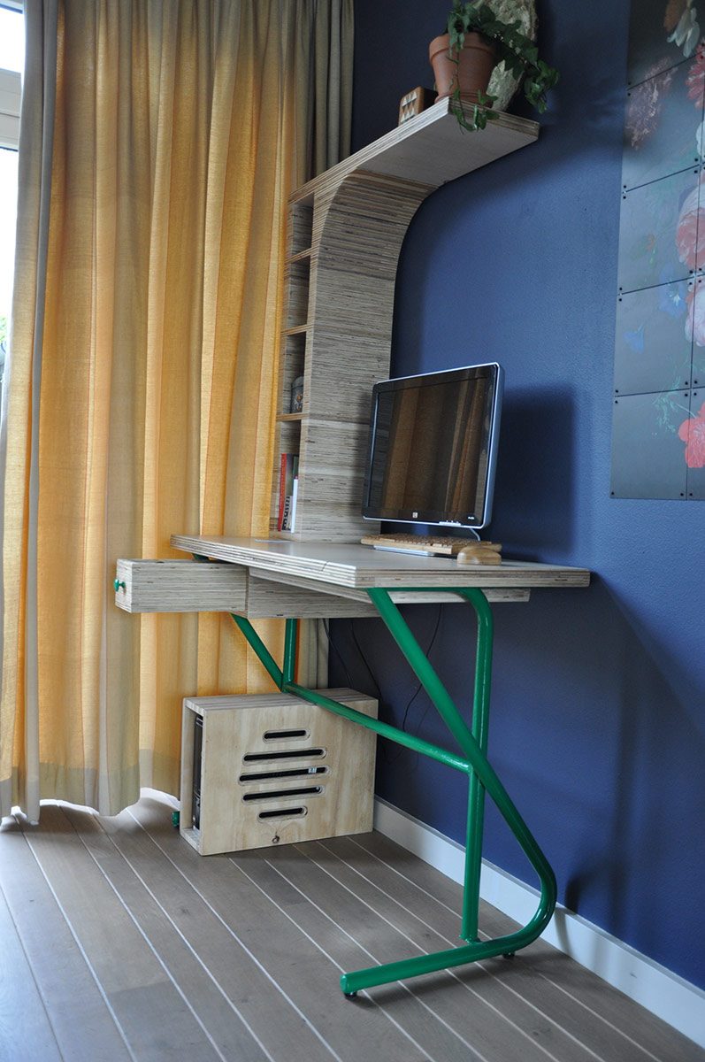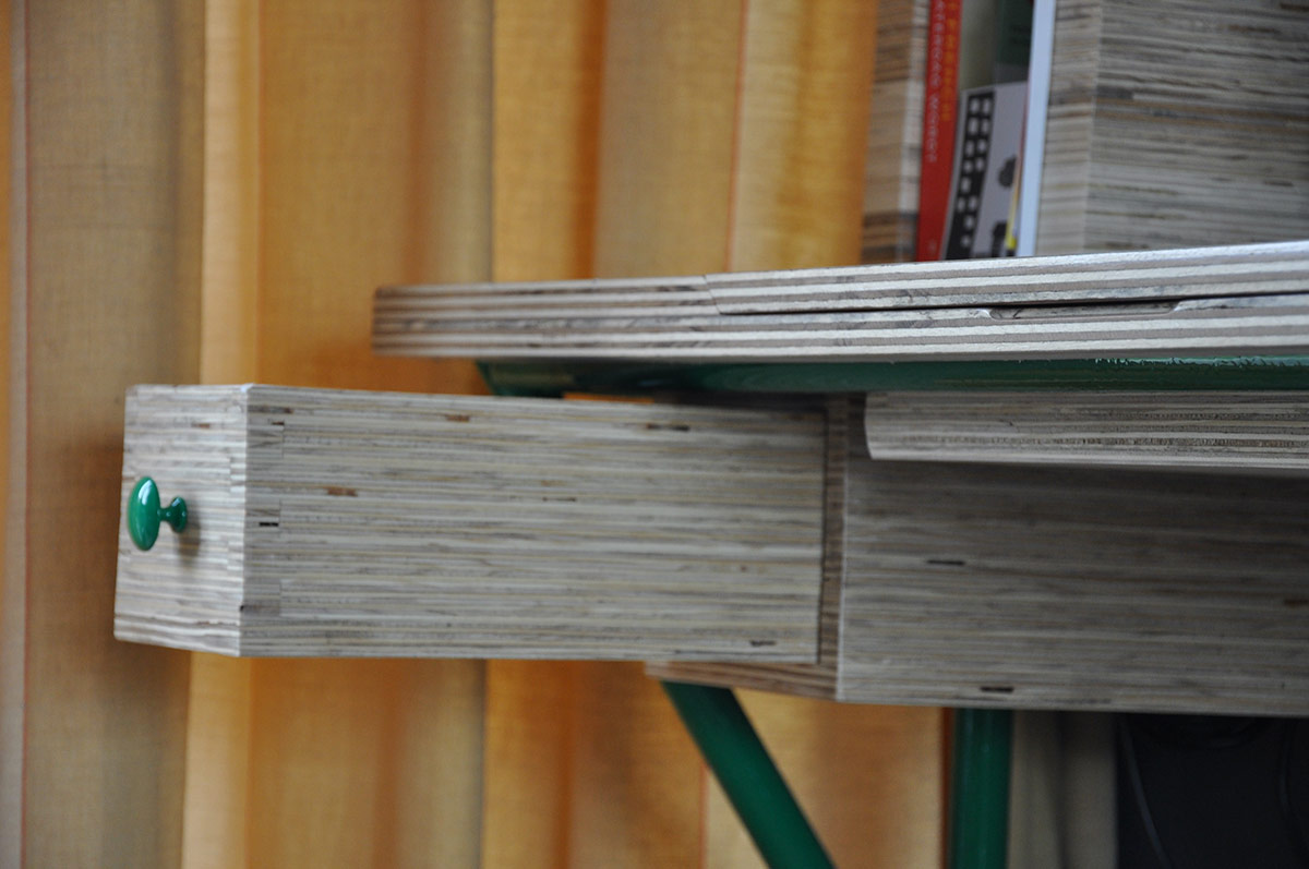 Klassiek lessenaar onderstel met gestapelde multiplex opbouw.