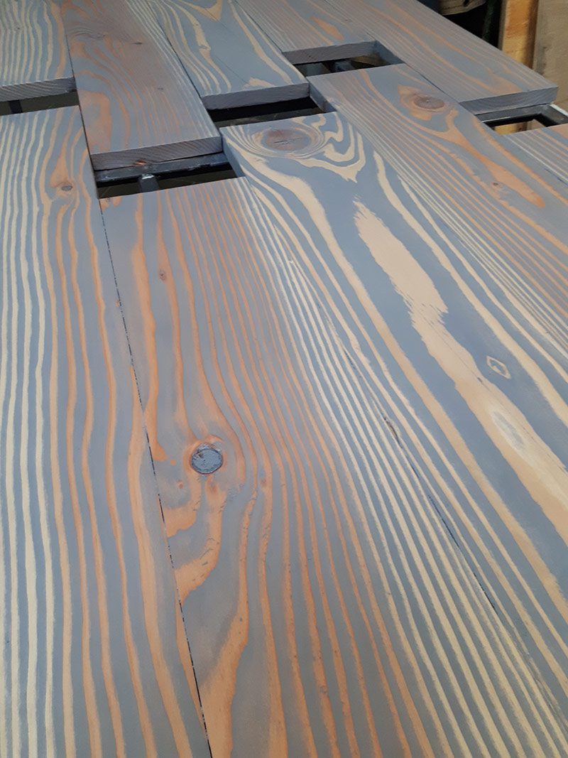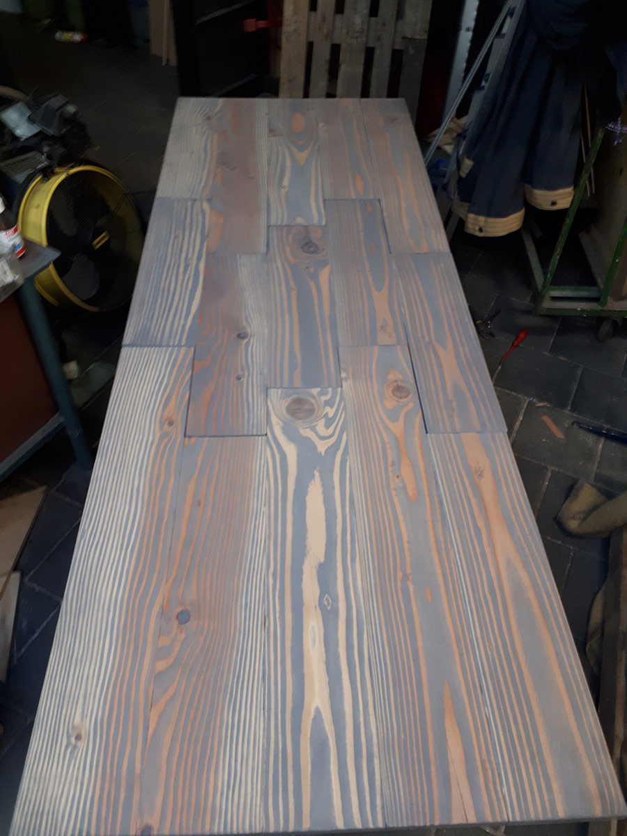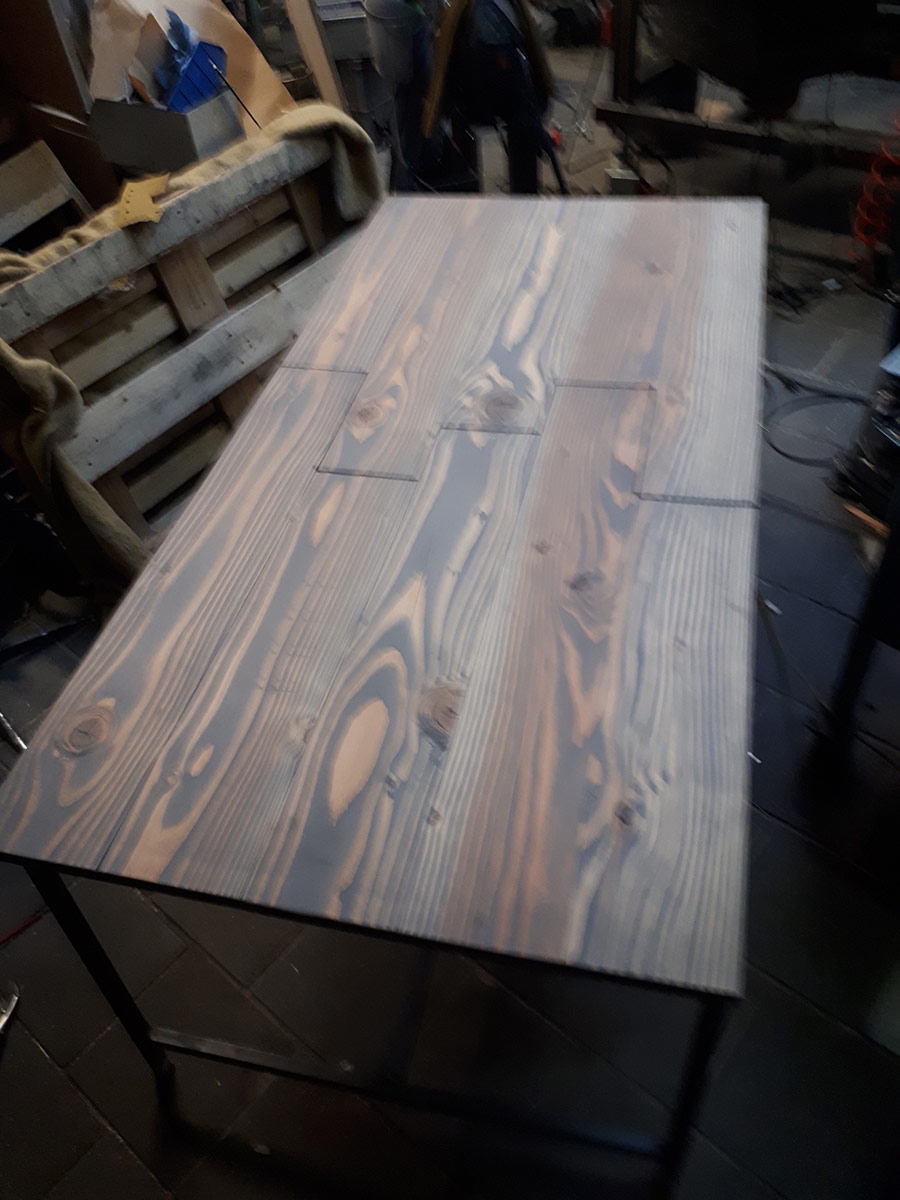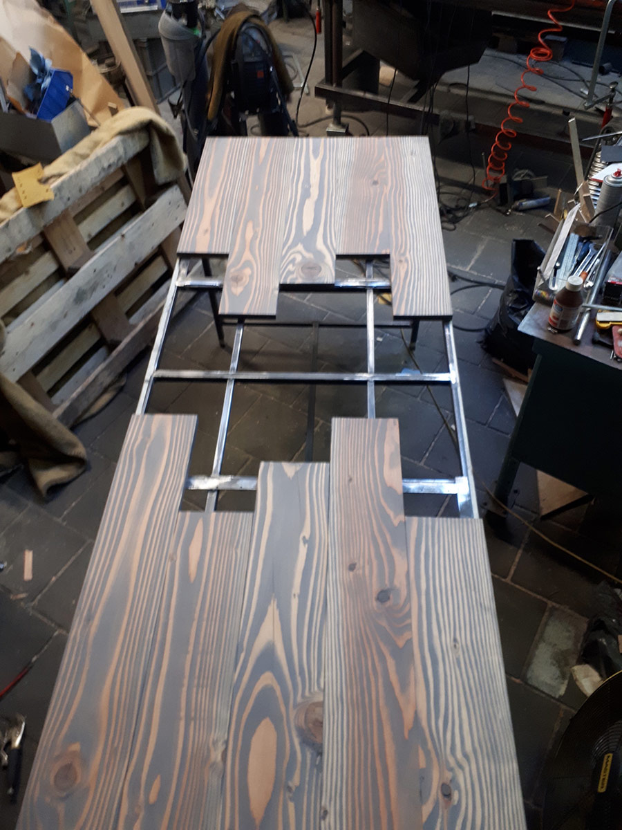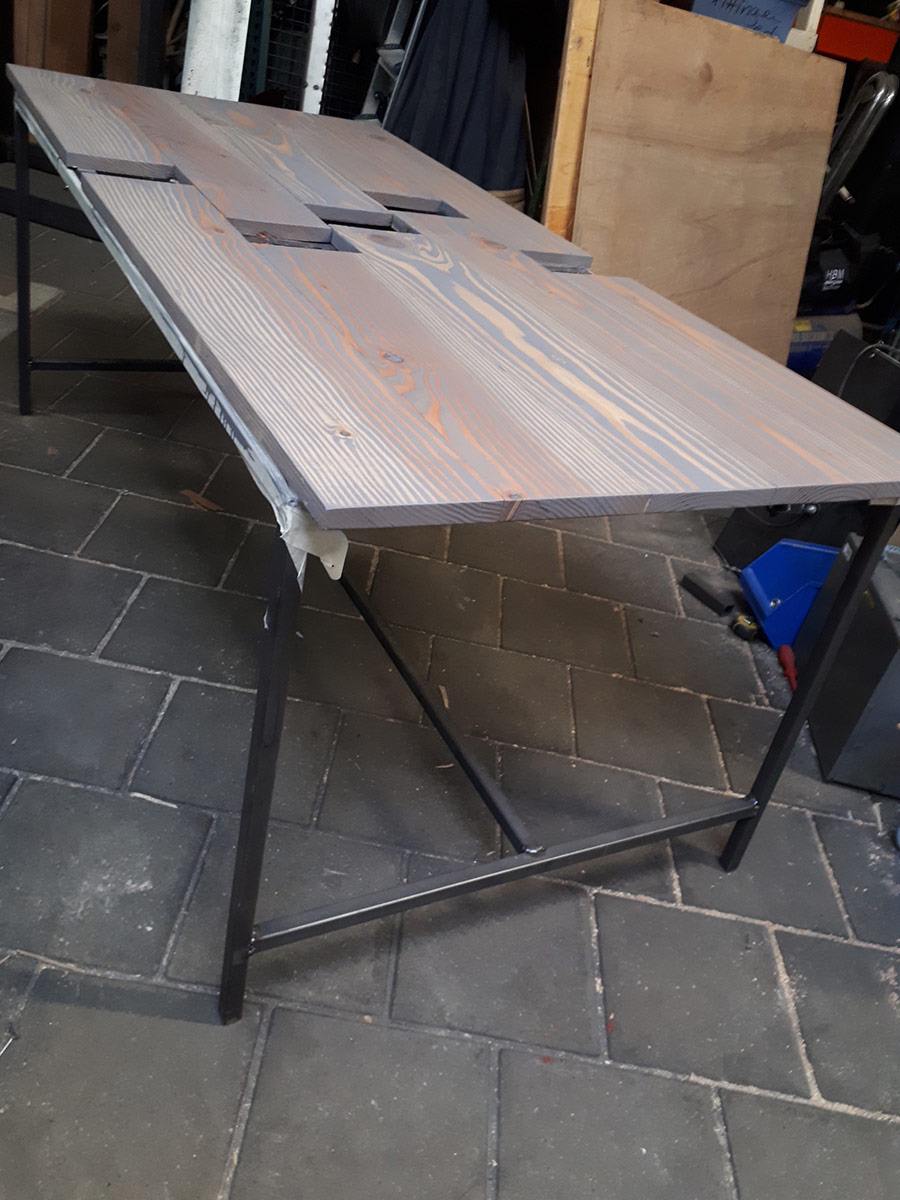 Tafel met mogelijke verlenging door uittrekken en inleggen. Op stalen onderstel.