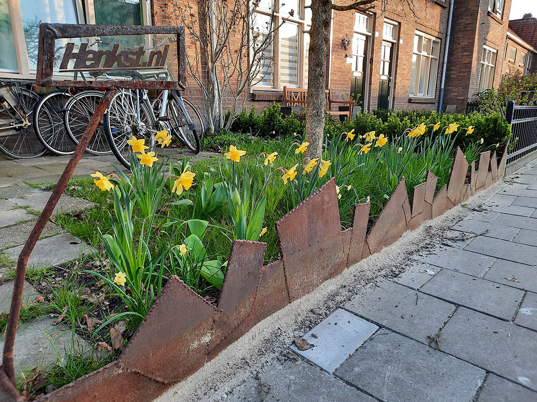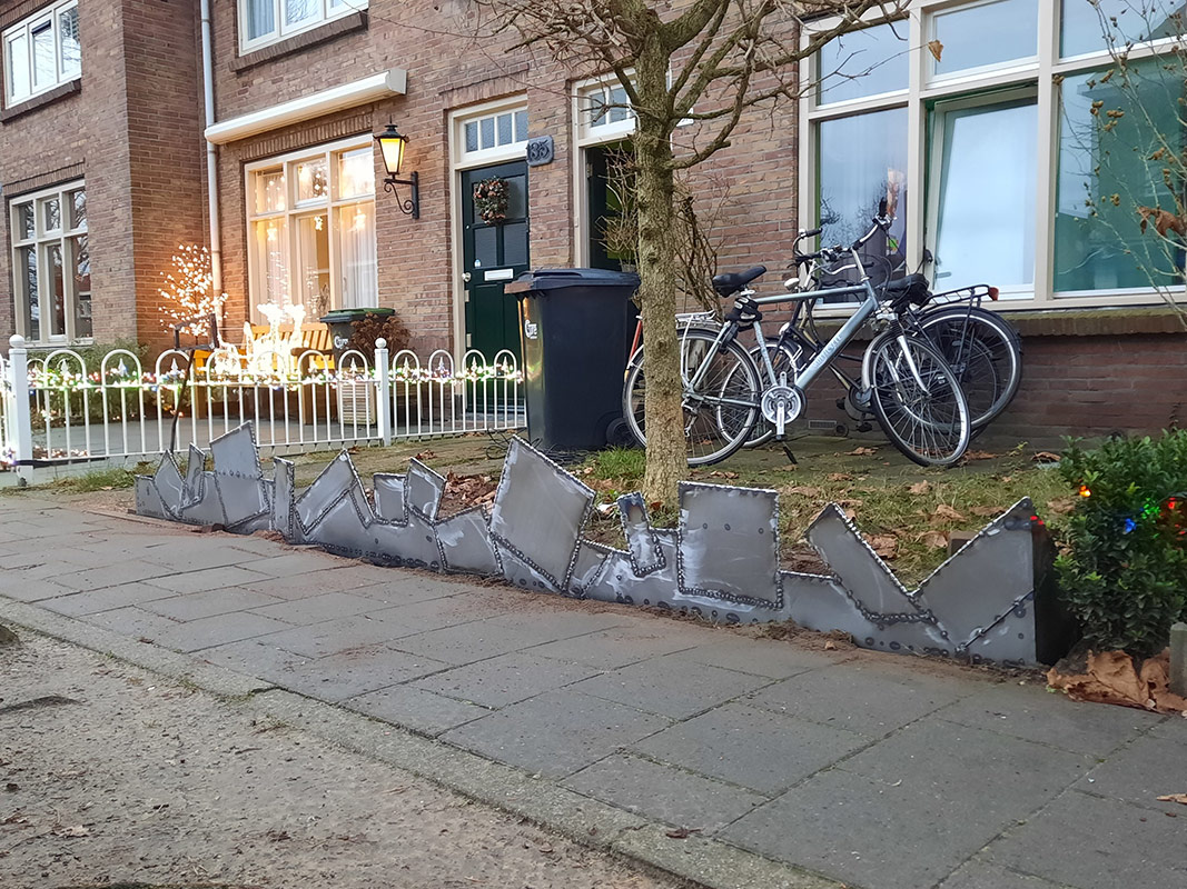 Border opgebouwd uit vierkantjes en rechthoeken, tekst is Roest in Glas.