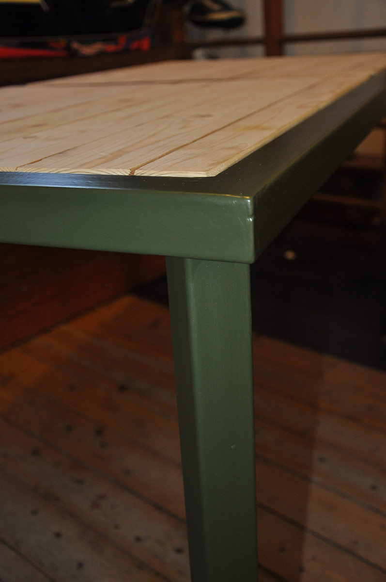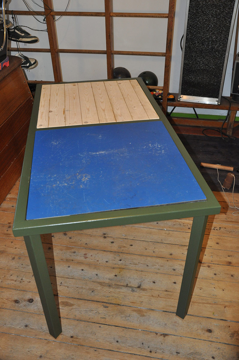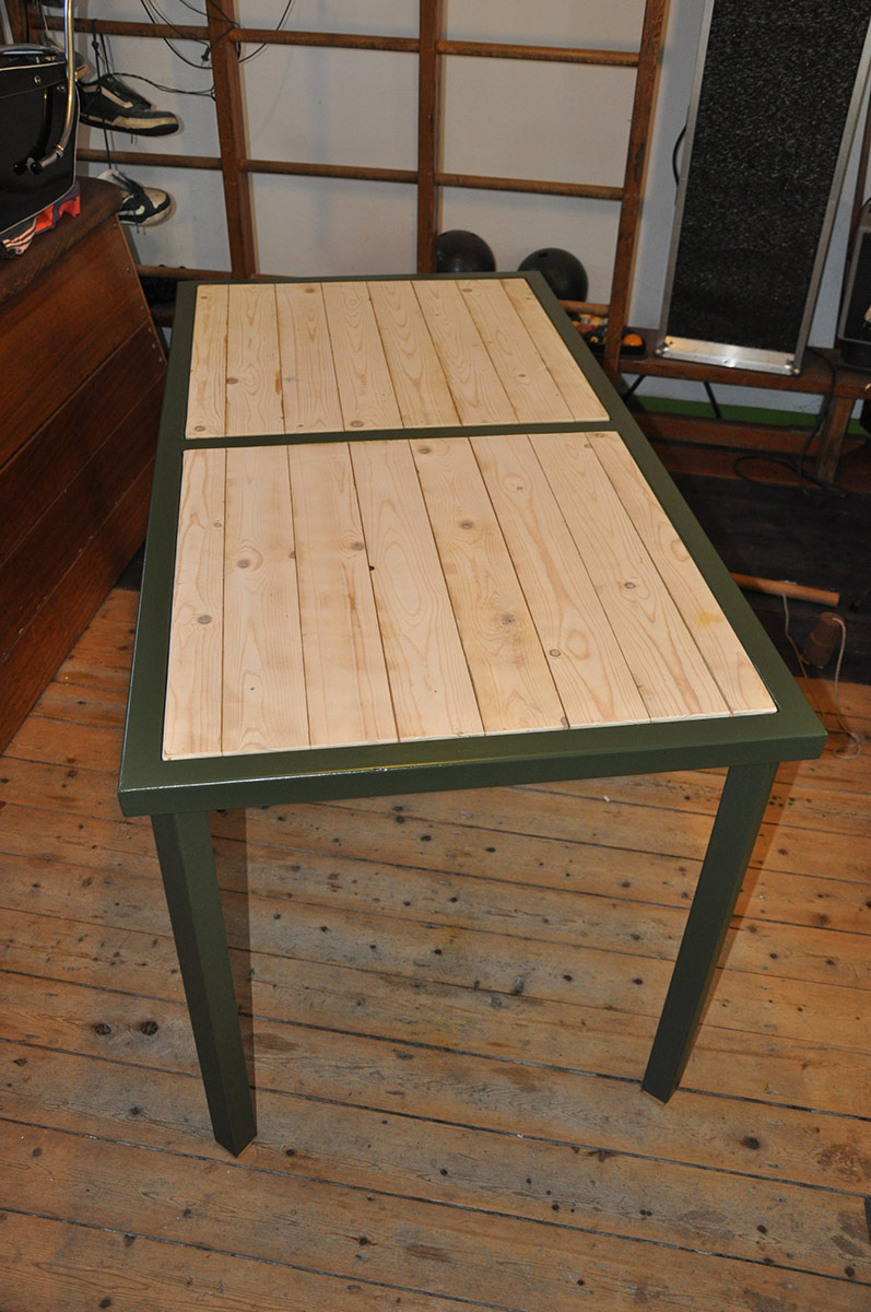 Compacte tafel met 2-zijdige bladen, houtkant voor beeld en dineren, trespa-kant voor knutselen, wild kleuren, solderen enz.